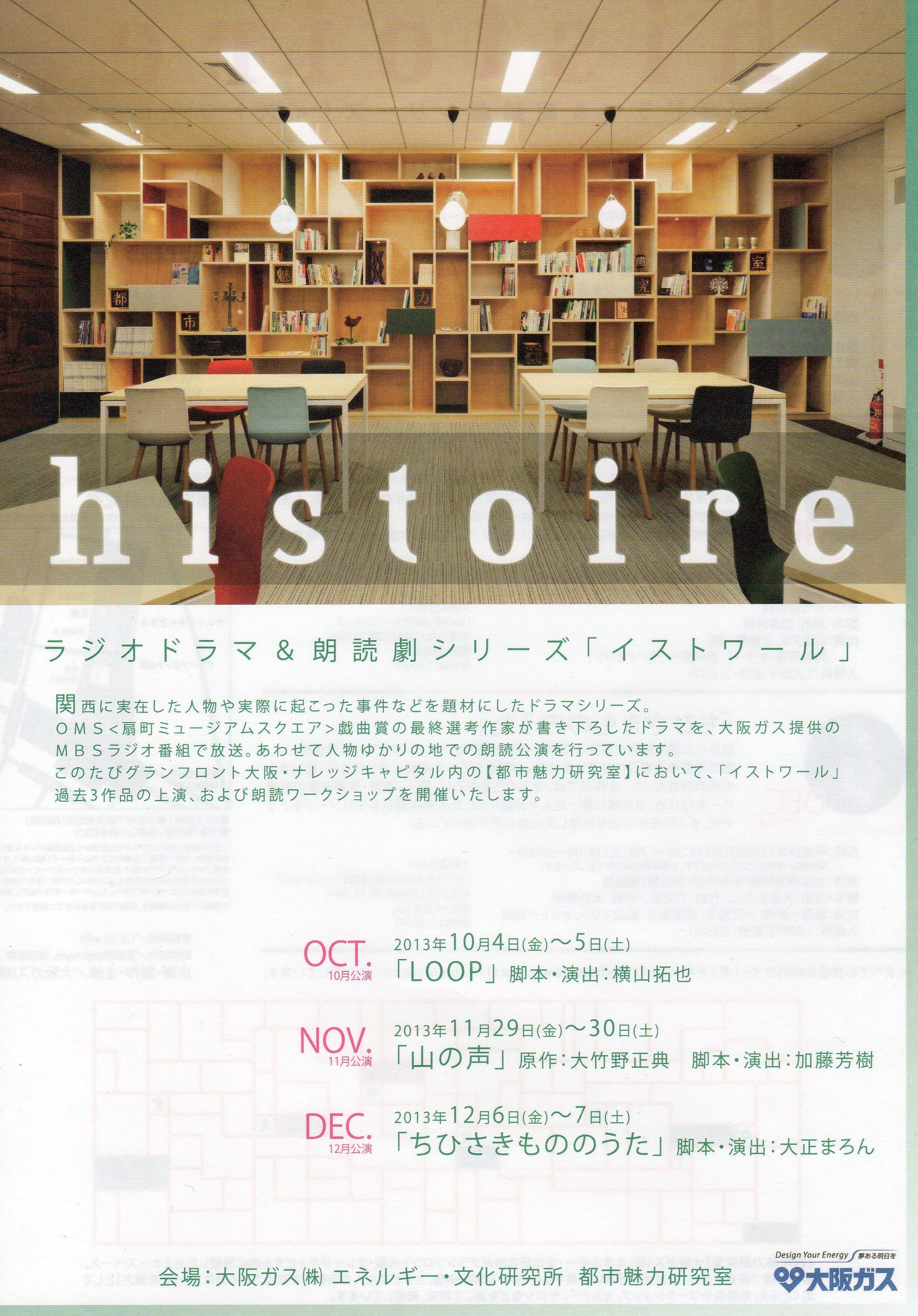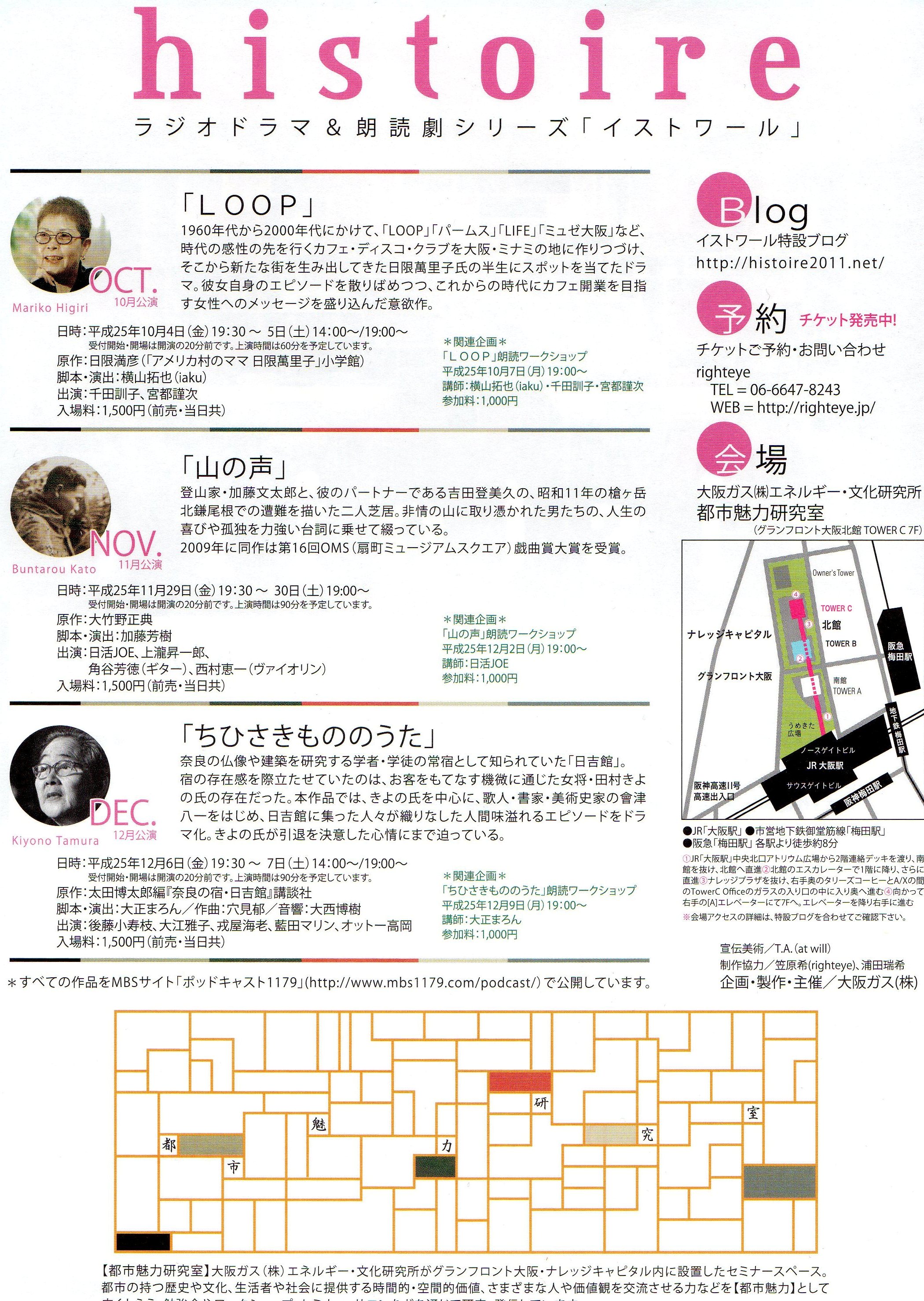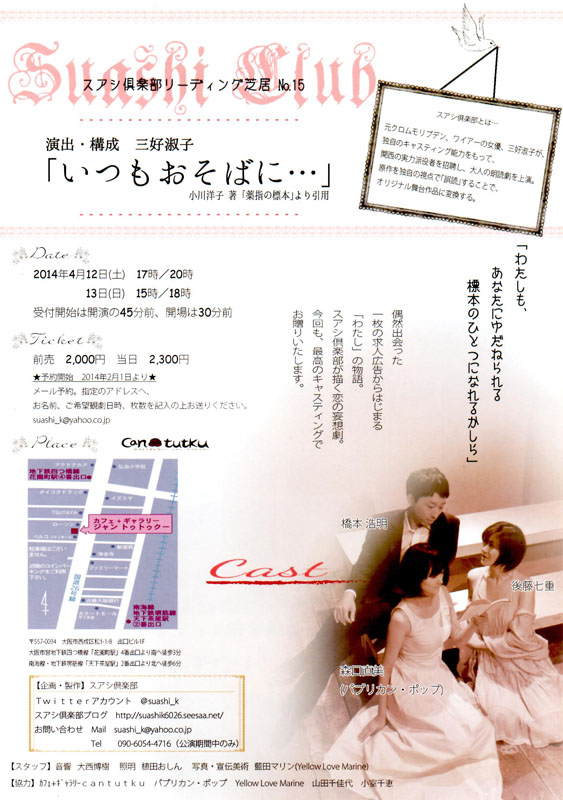 「いつもおそばに・・・」演出・構成 三好淑子 偶然見つけた一枚の求人広告からはじまる、「わたし」の物語。 スアシ倶楽部が描く恋の妄想劇、今回も最高のキャスティングでお贈りいたします。 *出演者 橋本浩明 森口直美(パプリカン・ポップ) 後藤七重 *場所 カフェ+ギャラリーcan tutku(花園町) *日時 2014年4月12日(土) 17時/20時 13日(日) 15時/18時 受付開始は、開演の45前、開場は30分前。 *料金 前売 2,000円 当日 2,300円 予約開始 2014年2月1日より メール予約。 指定のアドレスへ、お名前、ご希望観劇日時、枚数を記入の上お送りください。 suashi_k@yahoo.co.jp *********************************** そして三好淑子さんのツイッター