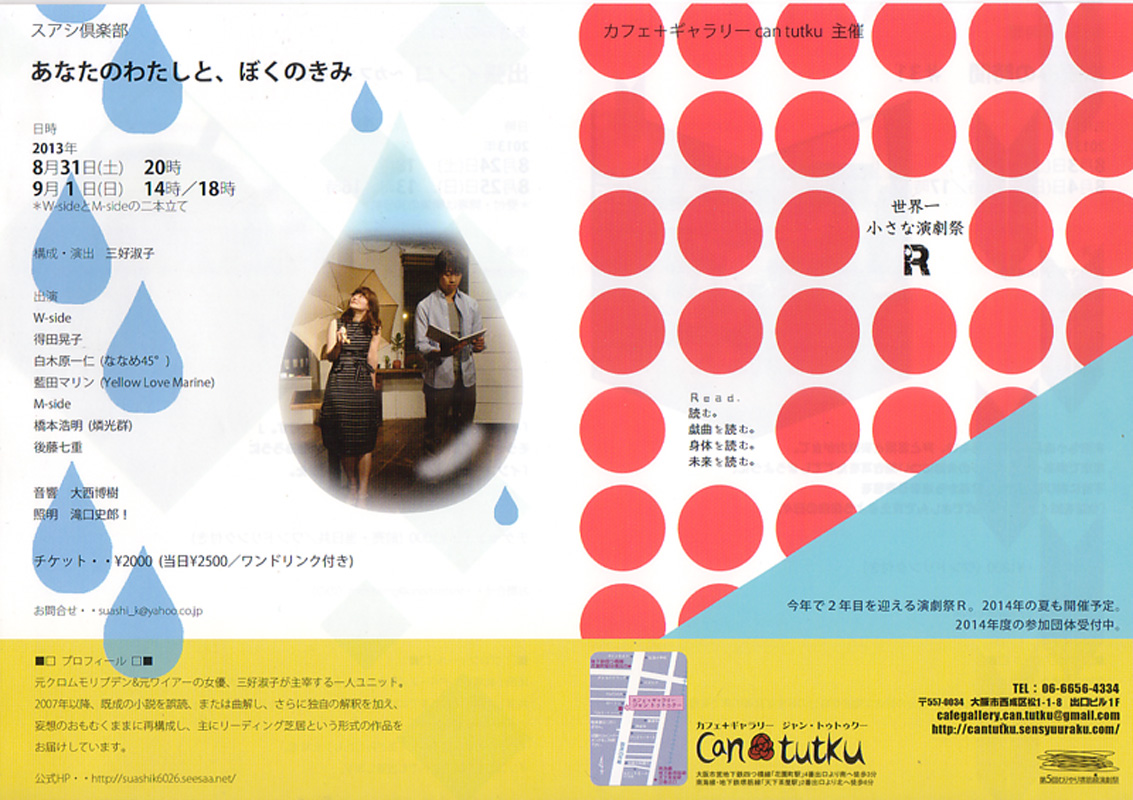 今回は会場が違うところなので また、何といっても二本立てですから、 皆様、どうぞお楽しみに。 以下、スアシ倶楽部ホームページより *********************************** *豪華ゲストによる単独二本立てです。 構成・演出 出演 M-side 日程 会場 チケット代・・¥2000(当日¥2500) 問合せ・ご予約は・・suashi_k@yahoo.co.jp *チケット予約は、上記アドレスへ、希望日時、枚数、お名前をご連絡ください。 ***********************************
