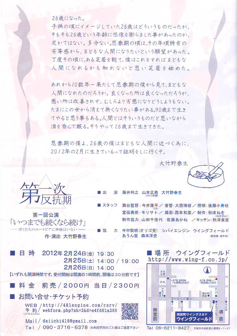 ほぼ日刊イトイ新聞 今日はMayさん観劇日。 一心寺には、なしゃりさんが眠っているのでお参りしてから劇場へ。 アカたん とも無事合流。座ってまもなく、3列前の人がリーフレットじっくり読んでくれている姿が目に ![]() ひな壇になってる客席なので、しかと見えました ![]() よくよく見つめていると、どことなく見覚えある後ろ姿。 たぶん、ある劇団の方でした。 ○○さん、ありがとうございます ![]() ![]() 『チャンソ』 めっちゃ、よかったです ![]() 男の人を見ていると、時々こういう気持ちになることがありますが、 男に生まれて、あの仲間に入れて貰って一緒に舞台に立ちたかった。 男同士っていいなぁって、無性に憧れます。 スコップ団を見ていても、それは本当によくそう思います。 『チャンソ』、もちろん女優陣も素敵でしたよ。 こっち(客席)じゃなくて、あっち(舞台)がいいって 思いながら観た演劇人はたくさんいるのではないでしょうか。 終演後、あかねさんと一心寺シアター事務局にお願いに伺って こちらにもリーフレットを置かせていただきました。 一心寺を訪れる方々に、どうぞご活用いただけますように ![]() Mayさん、Micro To Macroさん共、千秋楽、おめでとうございます。 大変お世話になりました。ありがとうございました。 明日はねおぱぁくです ![]() カフェ公演ということで、コンパクト。 パンフレットも手渡しだと聞いています。 たぶん、挟み込まれているチラシ群も 今までより少ないのでは。 その分、リーフレットが目に留まり、 じっくり読んでいただけることに繋がりますように ![]() ねをぱぁくは 明日2月20日(月) open18:00 start 19:30/22:00 一人芝居『或るめぐらの話』 構成/演出/出演 山田百次(劇団野の上) 『月曜劇団の会議は踊る』 作/西川さやか 演出/上原日呂 出演/月曜劇団 西川さやか ヤマサキエリカ 上原日呂 場所:日本橋味園ビル2階 Live&CafeBar PLACEBO 料金: 2000円 (BarCharge,PerformanceCharge,1drink) ご予約: neopark01@gmail.com です ![]() そして、リーフレット挟み込み情報追加です