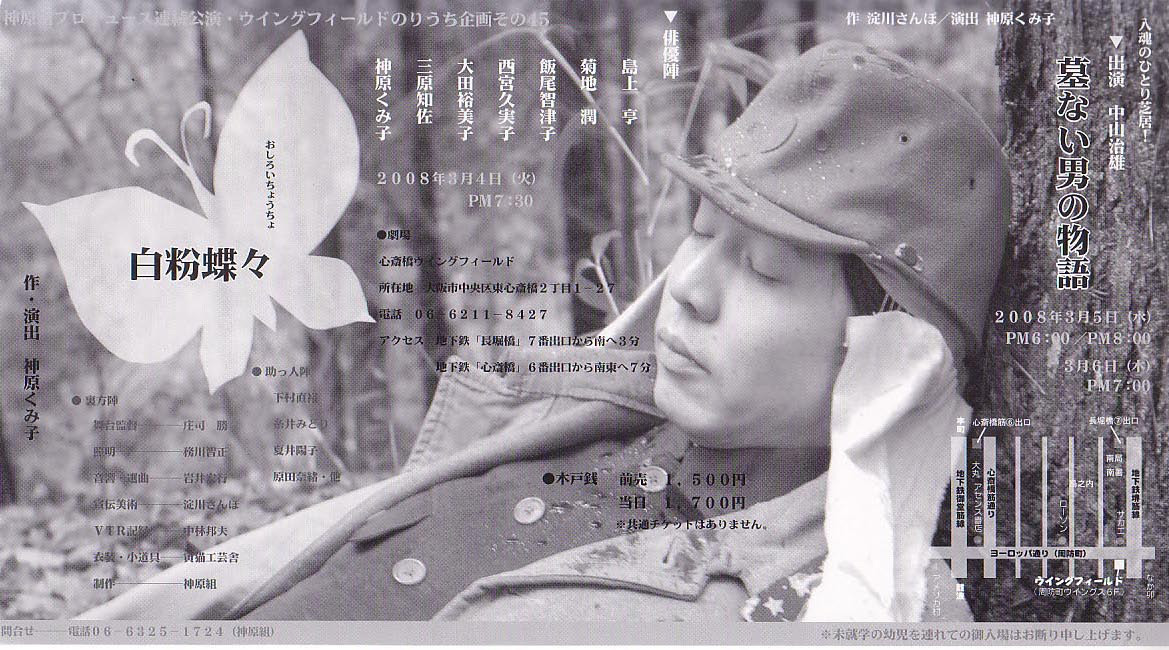 I原さま(3月22日、土曜日PM3:00…1枚) 記述いただいた ご連絡先に間違いがあるようで メールが戻ってきてしまいます。 再度ご連絡いただけるよう、お願い致します。 by 藍田マリン 来週の火、水、木の3日間 ウイングフィールド のりうち企画 その45として 神原組のプロデュース公演が2本あります。 本日はそのご案内。 まずは2008年3月4日(火)19:30~ 『白粉蝶々(おしろいちょうちょ)』作・演出 神原くみ子 旗揚げの処女作「 花の寺-班女の扇 」での女の場を ほとんどそのまま中心に据えた神原ワールドの原点。 たった一夜の切ない共同幻想を。 出演 / 飯尾智津子 西宮久実子 三原知佐 大田裕美子 島上亨 菊地潤 神原くみ子 料金 / ¥1500 この公演は一回こっきり、見逃し注意 ![]() 『白粉蝶々』で 私が特に注目するのは神原組初参加の飯尾智津子さん。 多くの演劇人から『ロッテさん』の愛称で呼ばれ、 敬愛されているベテラン女優さんです。 ぴよっ子マリン がまだぴよぴよぴよっ子![]() ![]() だった頃からのお付き合い。なしゃりさんと共に、今の私の芝居観や役づくりに最も影響を与えた人の一人。 先日、情宣兼ねて稽古場におじゃました時、 ロッテさんのシーンを観て、 「わぁ!ロッテさんの芝居やぁ~ 」って感激しました。いえいえ別にここ何年かにもロッテさんの舞台は拝見しているのだけれど たぶん、今回のシーンのテイストが、 以前一緒に舞台を踏んでいた頃とどこか重なってなつかしく、 本番でもう一度観れることが、とてもとても楽しみなんです ![]() 代わって 2008年3月5日 18:00~ * 20:00~ 6日 19:00~ 入魂の一人芝居、この3ステージをこなすのは -レンチの中山治雄さん! ~今回の俺は凄いで~。惚れたらアカン~、もうやめて~、ってなくらいの勢いや~ って案内メールが来ました ![]() 特に女子は覚悟して観るように (笑)実際、かっこいいと思いますよ~ 実力派ですから ![]() 実は私が吉田トミーを指名で『宮城野』公演するといった時、 「吉田でええの~ぅ?中山くんの方がいいんちゃう~ん?お客も呼べるしぃ~。うしゃしゃ♪ 」ってな感じでいじられトミー、みんなにからかわれてました。 後に中山さんに 「やっぱり中山さんの方がよかったってみんなに言われないよう頑張ります! 」と宣言しにいったよう。 可笑し可愛いエピソード。 『 墓ない男の物語 』 作・淀川さんぽ ソ連の卑劣な参戦により、敗戦後シベリアに抑留された北支の日本兵達。 過酷な労役と劣悪な待遇に耐え、 帰還を夢みて果たせなかった無念の将兵達に捧げる 鎮魂のひとり芝居 ! 出演 / 中山治雄 演出 / 神原くみ子 料金 / ¥1500 ※2本立てでなく連続公演ですよ~、くれぐれもおまちがえなく ![]() 『宮城野』オフィシャルサイト チケット購入はこちらから ![]() メールフォーム by 藍田マリン |